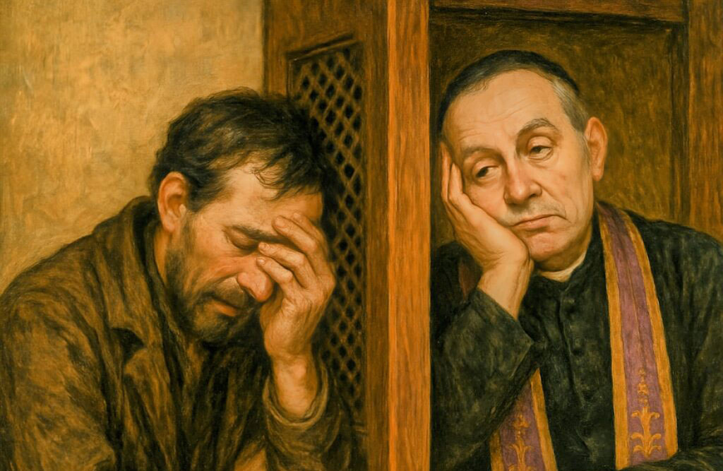 After a few years of hearing confessions, the priest cannot help but become numb, cynical, or bored. It’s just human nature. No human being is able to bear sin as the priest is required to without developing some sort of predictable responses that become rote. The priest is trying to act like God in his sympathy for the sinner, but he ends up being merely what he is, a sinner.